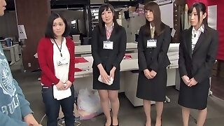 Two pretty office employees Bluelah and Jess Harrington are playing with their chief's cock in a hot CFNM