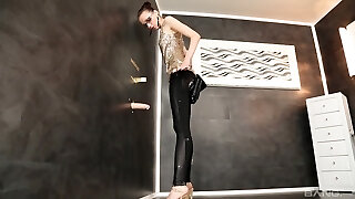 Glamour bitch in tights seduces barman and gets her fuckbox fucked right on the bar counter