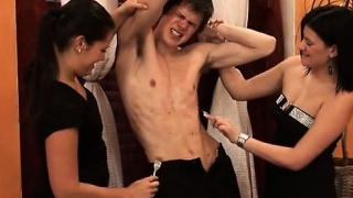 Kinky milf fucks horny dude with strapon and examines his anus with mitten hands